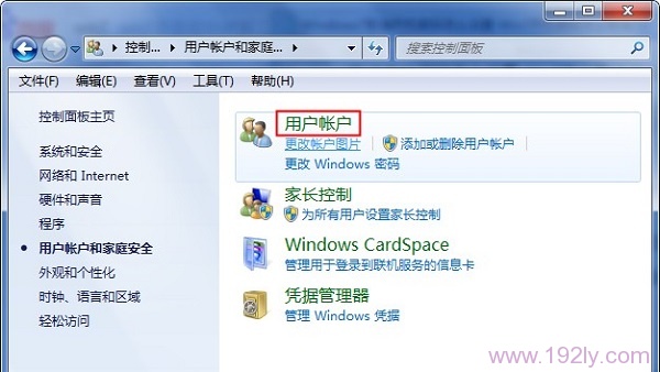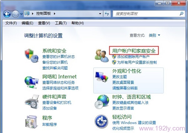2、在控制面板界面中,点击“用户帐户和家庭安全”这个选项,如下图所示: