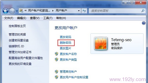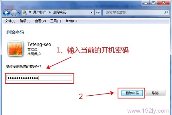 5、先输入你的Windows 7电脑的开机密码,然后点击“删除密码”选项,如下图所示。