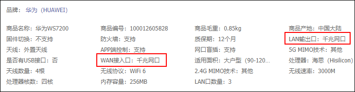 如果你正准备购买一个千兆的无线路由器,可以直接询问商家路由器的WAN口和LAN口是否全是千兆? 或者在商品页面找到参数介绍的地方,自行查看路由器的WAN口和LAN口速率,如下图所示。