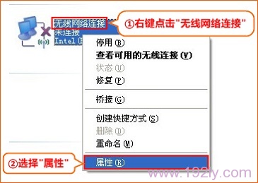1、鼠标右键“无线网络连接”——>选择“属性”