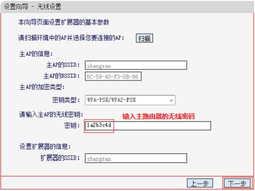 在“密钥”选项中输入被扩展信号的无线密码——>点击“下一步”