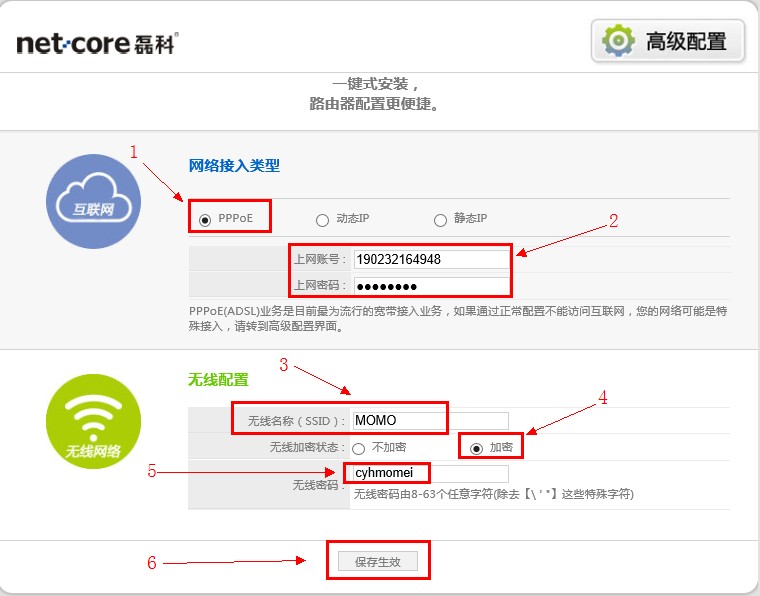 2、在“网络接入类型”下面选择“PPPoE”---->输入宽带运营商提供给的“上网账号”和“上网密码”---->在“无线配置”下面的“无线名称(SSID)”后面输入无线网络的名称---->在“无线加密状态”后面选择“加密”---->在“无线密码”后面设置一个复杂一点的密码---->点击“保存生效”。
