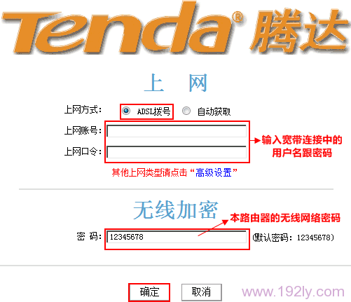 “上网方式”选择:ADSL拨号——>填写“宽带用户名”、“宽带密码”——>“无线密码”——>点击“确定”。