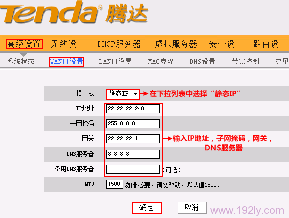 点击“高级设置”——>“WAN口设置”——>“模式”选择:静态IP——>填写“IP地址”、“子网掩码”、“默认网关”、“首选DNS”、“备用DNS”——>点击“确定”。