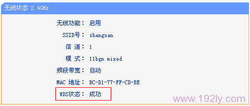 点击“运行状态”——>查看“2.4G_无线状态”下面的WDS状态,如果显示:成功,则表示WDS桥接设置成功。