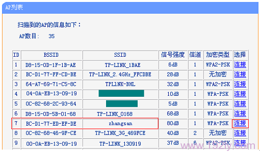 4、在扫描结果中,找到需要连接的无线信号名称(本例是:zhangsan)——>点击“连接”。